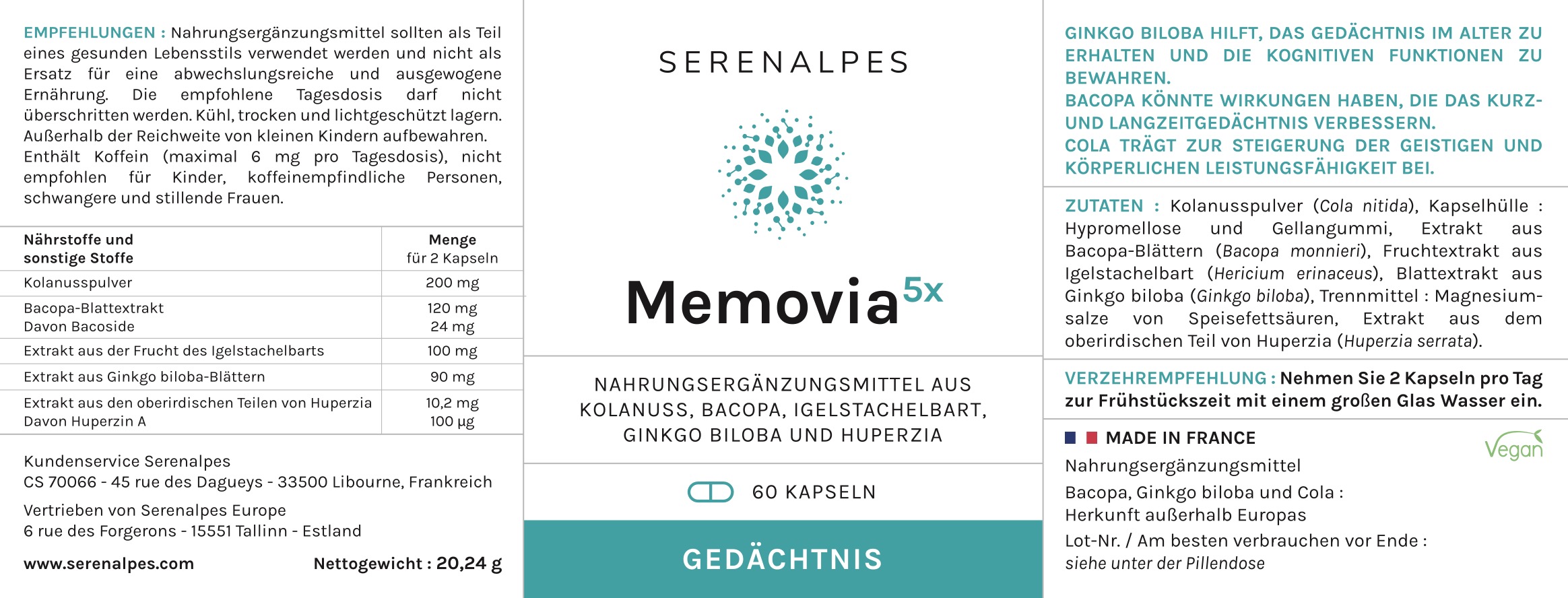 Kolanusspulver (Cola nitida), Kapselhülle: Hypromellose und Gellangummi, Extrakt aus Bacopa-Blättern (Bacopa monnieri), Fruchtextrakt aus Igelstachelbart (Hericium erinaceus), Blattextrakt aus Ginkgo biloba (Ginkgo biloba), Trennmittel: Magnesiumsalze von Speisefettsäuren, Extrakt aus dem oberirdischen Teil von Huperzia (Huperzia serrata).
